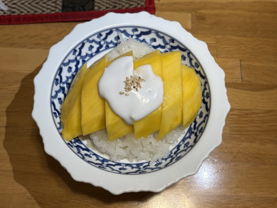 デザートも印象的。こちらは名前の通りマンゴーともち米のデザートです。果物とお米、と聞くと少し意外に感じるかもしれませんが、フレッシュなマンゴーと甘いもち米の組み合わせが絶妙。食べてみると、そのおいしさに納得します。